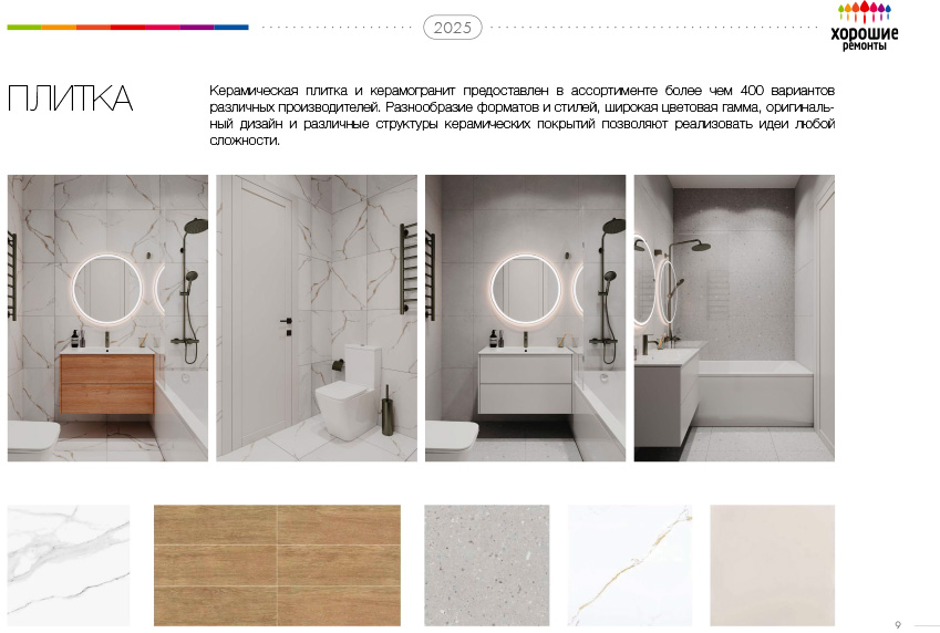 | Материалы: Керамическая плитка или керамогранит (стоимость до 1200 руб / м2). Общее количество плитки не должно превышать 25% площади объекта. |