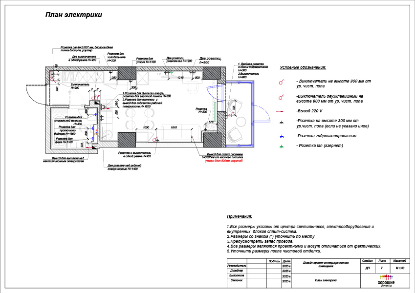 В состав электрики входят несколько чертежей, отражающих люстры, светильники, бра, розетки и выключали со всеми отступами и высотами.